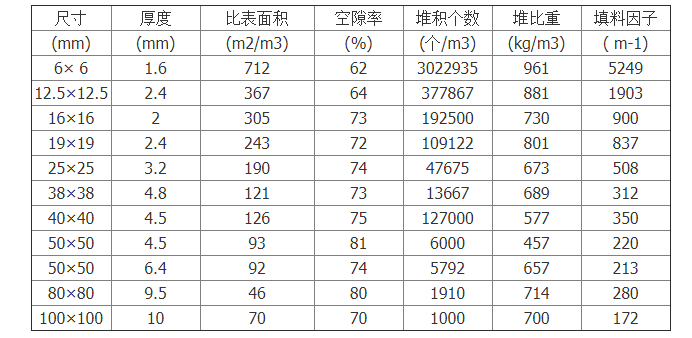 拉西環(huán)(Rasching ring)是工業(yè)上很早使用的一種人造填料。通常用陶瓷或金屬片,塑料做成,其高度與直徑相等,常用的尺寸為25mm~75mm(亦有小至6mm,大至150mm的)。陶瓷壁厚為2.5mm~9.5mm,金屬環(huán)為0.8mm~1.6mm,在強(qiáng)度許可的情況下,環(huán)的壁應(yīng)盡量減薄。拉西環(huán)雖然傳質(zhì)性能不理想,但由于結(jié)構(gòu)簡(jiǎn)單,制造容易,價(jià)格較低,仍為一些工廠采用。