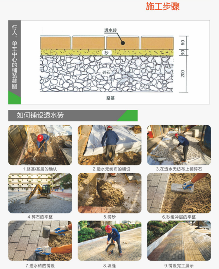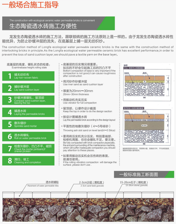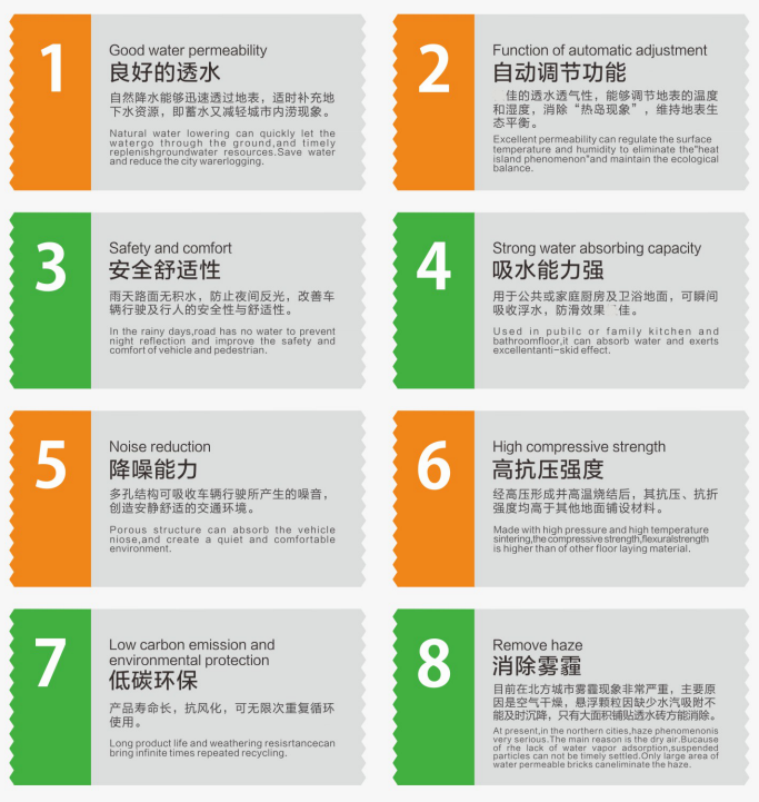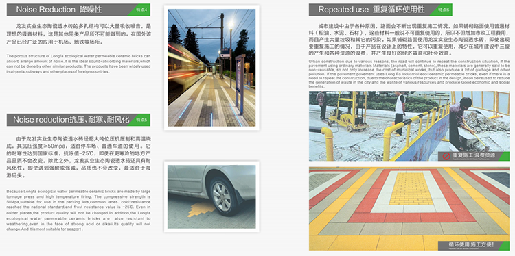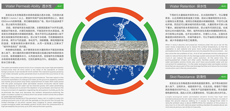 該生態(tài)陶瓷透水磚取材于廢瓷磚及廢棄陶瓷、煤矸石等廢舊物資,可廣泛用于公共建筑廣場(chǎng),城市道路、地鐵、車站、別墅、住宅、公園、藝術(shù)景觀、廚衛(wèi)空間等場(chǎng)所,具有保持地面的透水性、保濕性、抗壓、防滑、高強(qiáng)度、抗寒、耐風(fēng)化、降噪、吸音、可重復(fù)使用等特點(diǎn),產(chǎn)品經(jīng)測(cè)試中心檢測(cè),各項(xiàng)性能指標(biāo)均已達(dá)到或超過(guò)國(guó)內(nèi)外同類產(chǎn)品,可有效緩解“城市熱島效應(yīng)”,為恢復(fù)城市地面透水性,提高空氣質(zhì)量,消除霧霾,助力海綿城市建設(shè),建設(shè)生態(tài)家園貢獻(xiàn)一份力量。